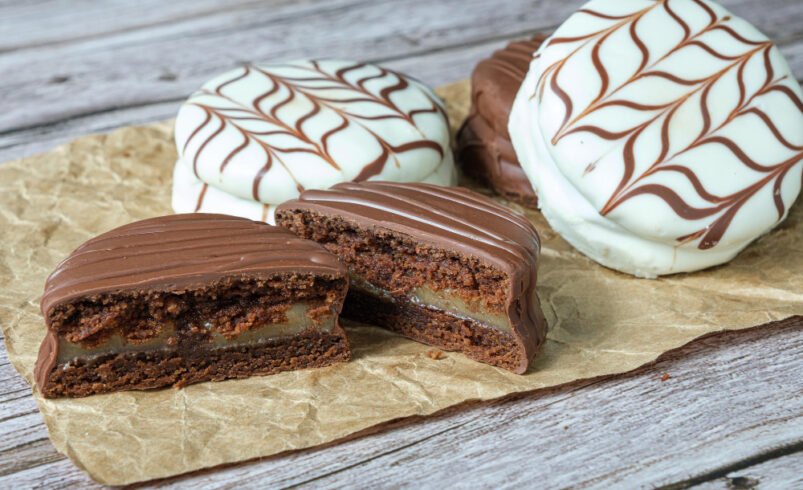 Versão moderna do pé‑de‑moleque com chocolate na massa.