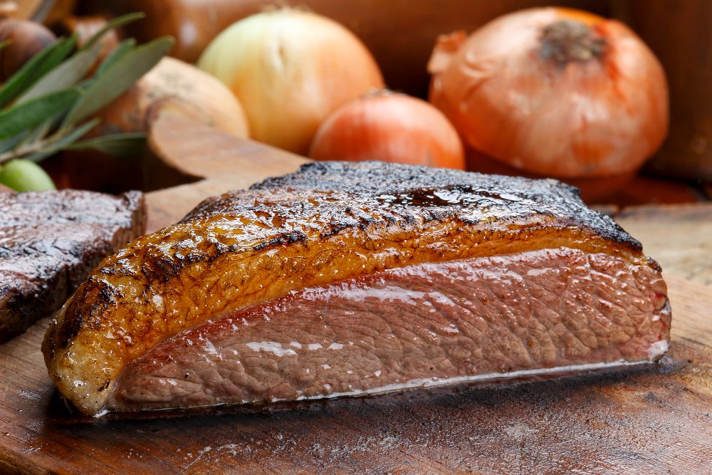 Corte nobre assado lentamente com sal grosso, mantendo a suculência.