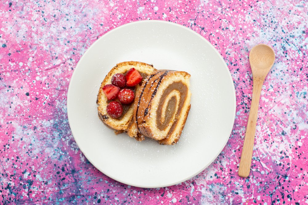 Pão‑de‑ló enrolado com recheio de doce de leite e cobertura de açúcar.