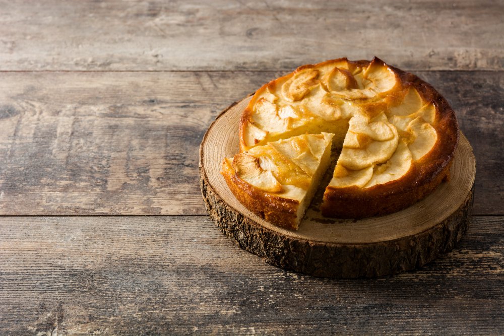 Torta caseira com massa amanteigada e recheio de maçãs temperadas com canela.